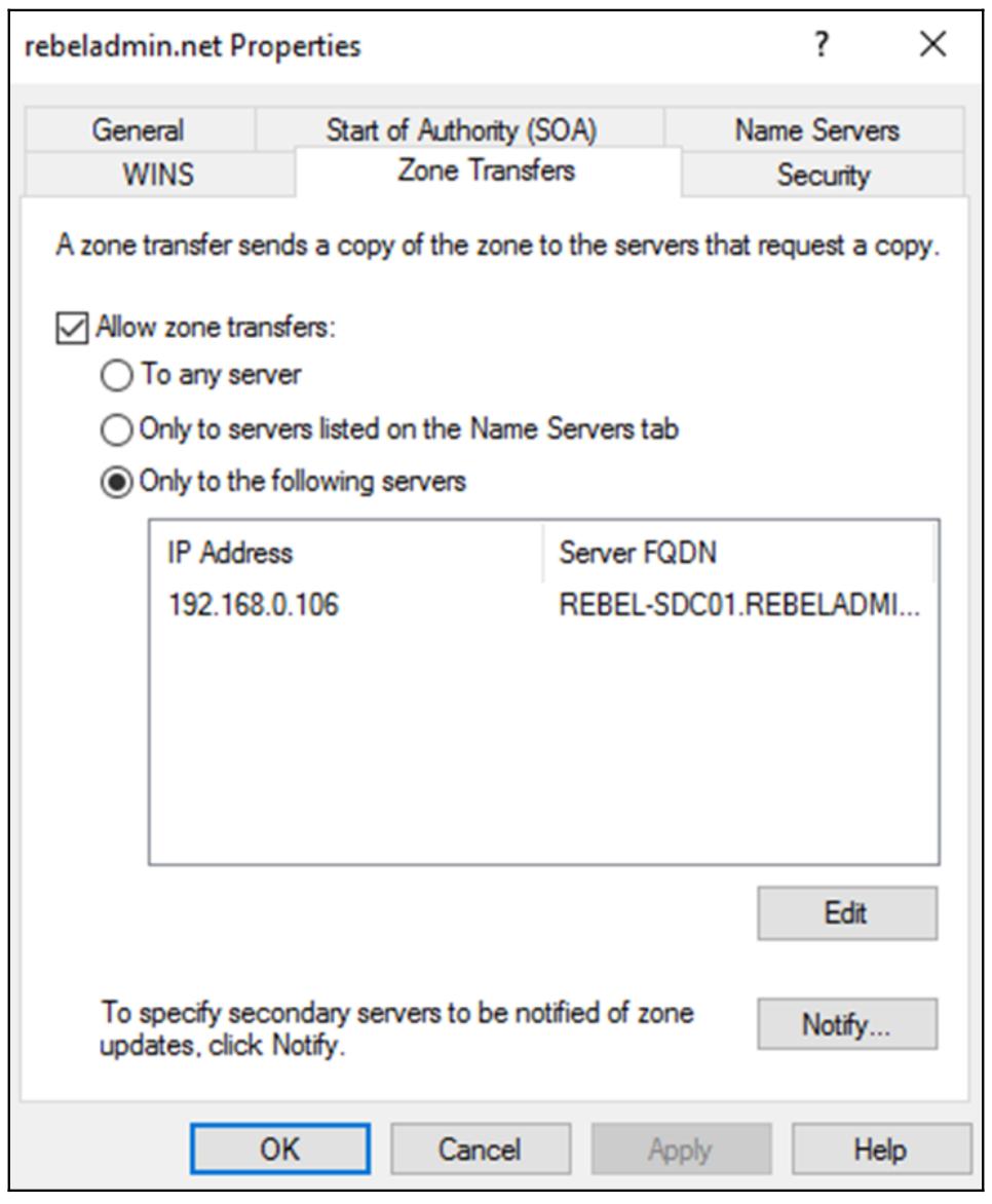Set-DnsServerPrimaryZone -Name "rebeladmin.net" -SecureSecondaries TransferToSecureServers -SecondaryServers 192.168.0.106