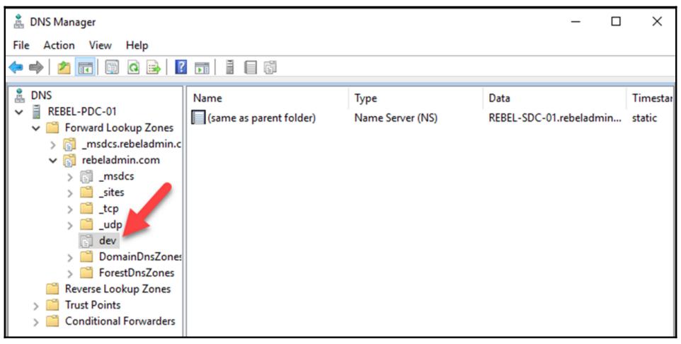 Add-DnsServerZoneDelegation -Name "rebeladmin.com" -ChildZoneName "dev" -NameServer "REBEL-SDC-01.rebeladmin.com" -IPAddress 192.168.0.110
