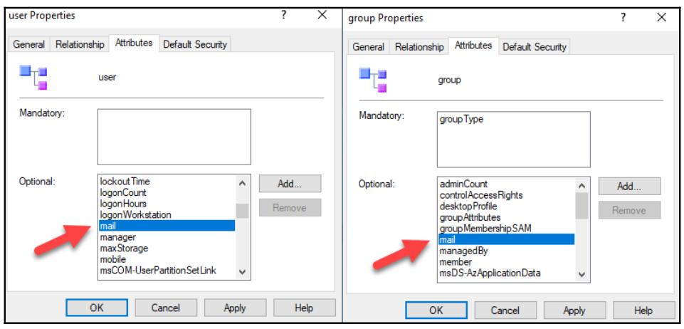 В нашем предыдущем снимке экрана я открыл некую оснастку схемы AD, а в ней раскрыл класс user. Чтобы открыть некую оснастку, перейдите в Run | MMC | File | Add/Remove Snap-in, а затем выберите из списка Active Directory Schema. Затем кликните Add и потом OK для завершения данного мастера. В окне свойств рассматриваемого объекта мы можем видеть список атрибутов, которые ассоциируются с выбранным классом user. Те же самые атрибуты могут быть также частью иных классов. например, атрибут mail является частью классов user и group: