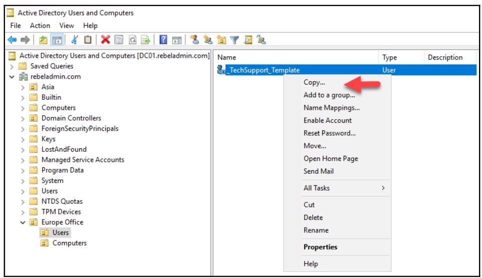 Теперь, когда мы заходим в ADUC, мы можем наблюдать этот новый шаблон. Чтобы создать из него какую- то новую учётную запись, кликните правой кнопкой по Copy...: