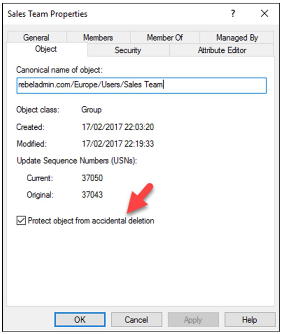 Защита объектов от непредумышленного удаления: Эта функциональность была введена начиная с AD DS 2008. Она была включена для объектов пользователей, компьютеров и групп. Это предотвращает неумышленное удаление объектов. Её можно включать на уровне индивидуального объекта или на уровне OU/ каталога. Это свойство следует отключать когда вы желаете на самом деле удалить некий объект.