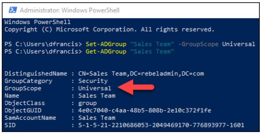 Set-ADGroup "Sales Team" -GroupScope Universal