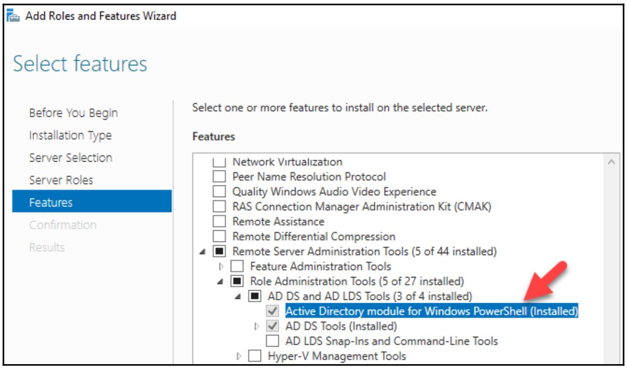 В диспетчере сервера его можно отыскать переместившись в Features | Remote Server Administration Tools | Role Administration Tools | AD DS and AD LDS Tools | Active Directory module for PowerShell, как это показано на следующем снимке экрана: