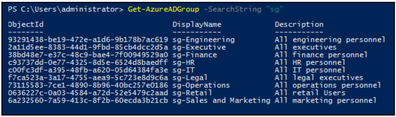 Get-AzureADGroup -SearchString "sg"