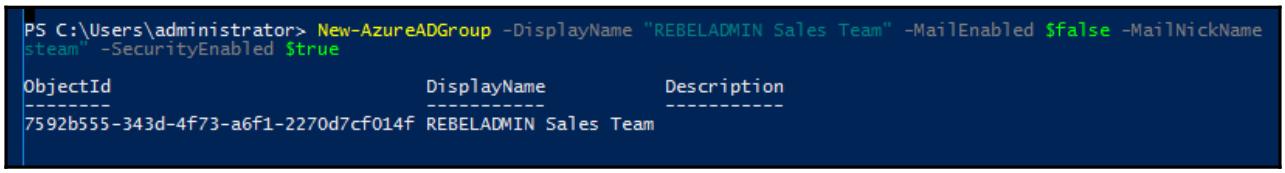 New-AzureADGroup -DisplayName "REBELADMIN Sales Team" -MailEnabled $false -MailNickName "salesteam" -SecurityEnabled $true
