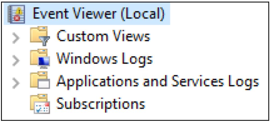 Как показывается на следующем снимке экрана, Event Viewer (Local) Windows имеет четыре различные категории для группирования журналов событий: