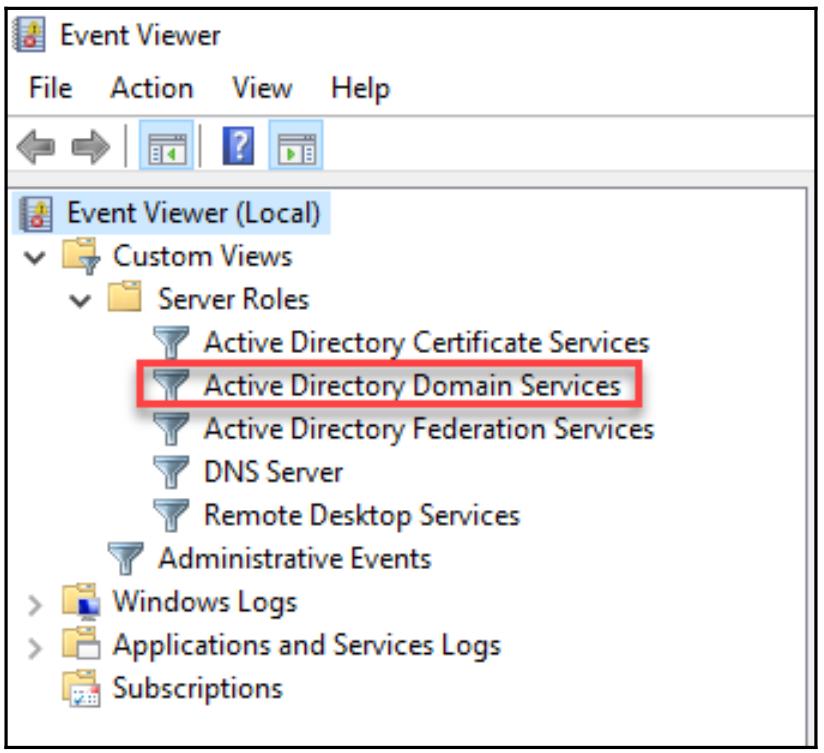 Подобные предварительно определённые индивидуальные обзоры основываются на установленных ролях. При добавлении ролей Active Directory Domain Services также создаются некоторые индивидуальные обзоры в имеющемся журнале событий, причём все они сгруппированы в разделе, относящемся к событиям Active Directory Domain Services, как это показано на следующем снимке экрана: