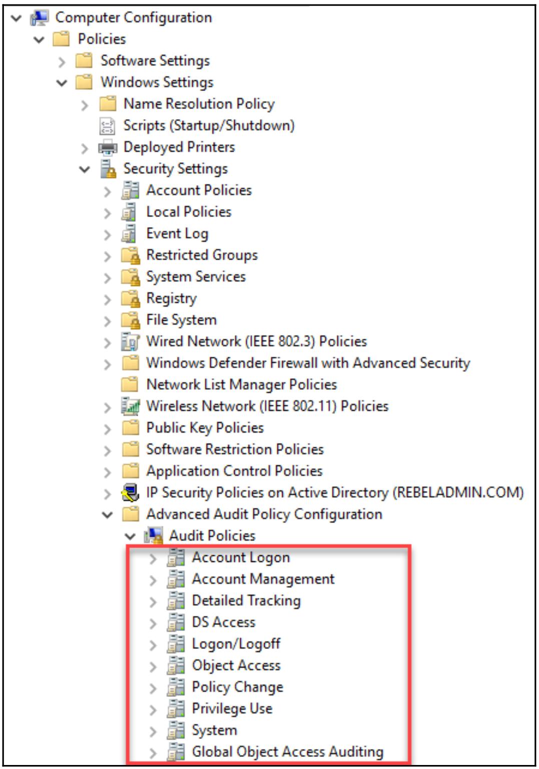 Наследуемый аудит Windows предоставляет девять категорий и все категории также имеют подчинённые.