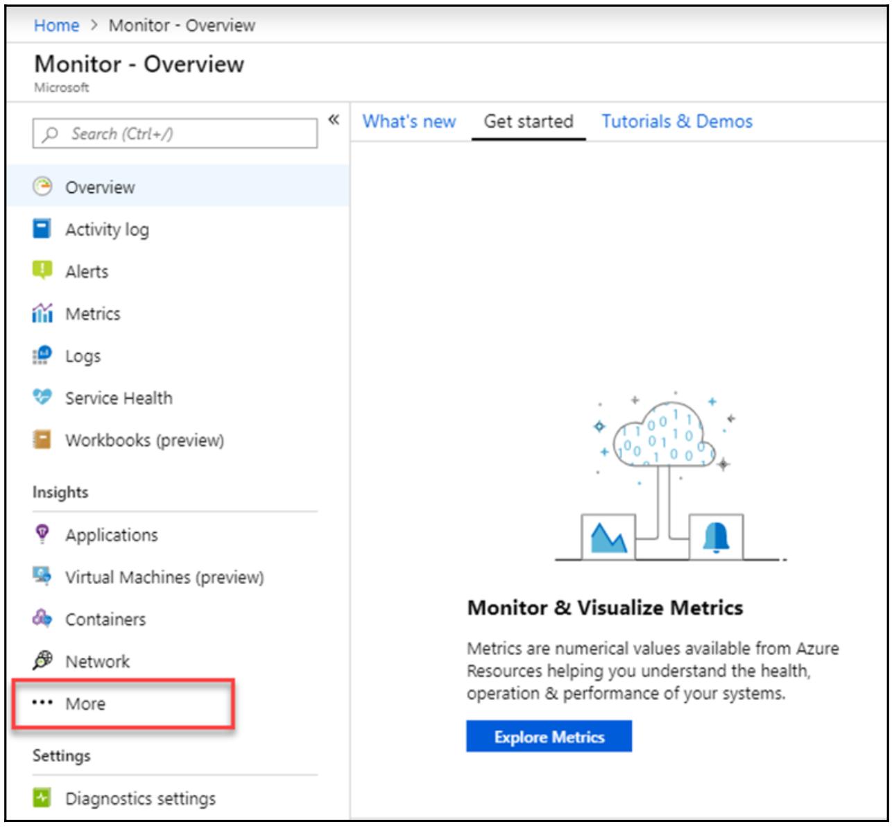 Для просмотра полученных сведений, зарегистрируйтесь в портале Azure и проследуйте в Monitor, кликнув по More в разделе Insights.
