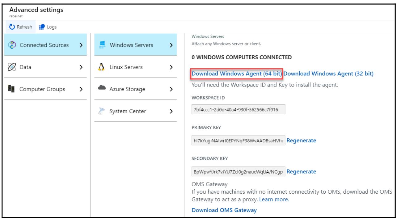 После этого перейдите в Windows Servers и кликните по Download Windows Agent (64 bit) для получения необходимого агента. Кроме того, выпишите идущие следом WORKSPACE ID и PRIMARY KEY, так как они потребуются в процессе установки этого агента, как показывает наш следующий снимок экрана: