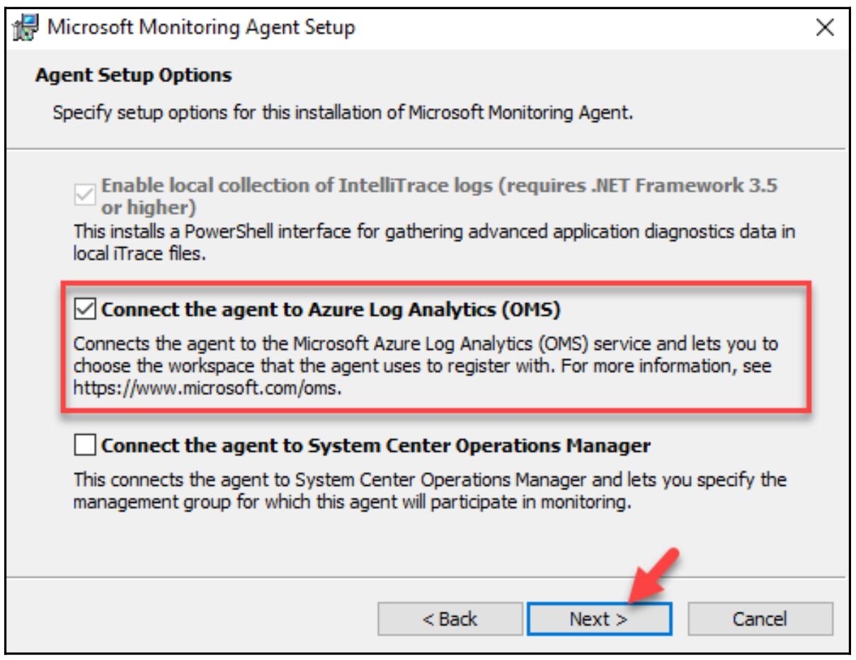 После выгрузки необходимого агента запустите его от имени Администратора. В появившемся окне Agent Setup Options выберите вариант Connect the agent to Azure Log Analytics (OMS) и кликните по Next, как это показано на снимке экрана внизу: