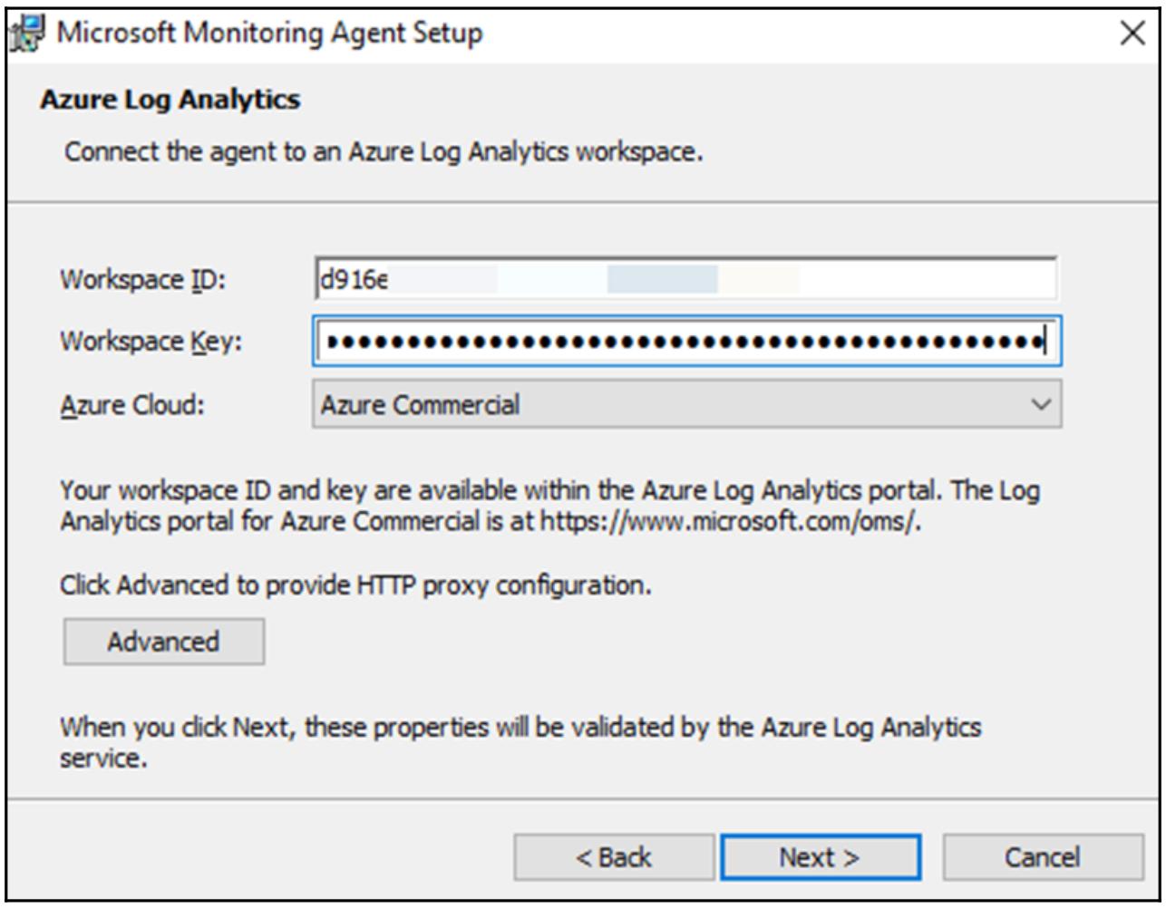 В появляющемся следом окне предоставьте Workspace ID и Workspace Key. Кроме того, выберите подходящее Azure Cloud. Если вы расположены за посредником (прокси), вам следует в этом окне также задать и установки этого посредника. По завершению кликните по Next, как это показано на снимке экрана далее: