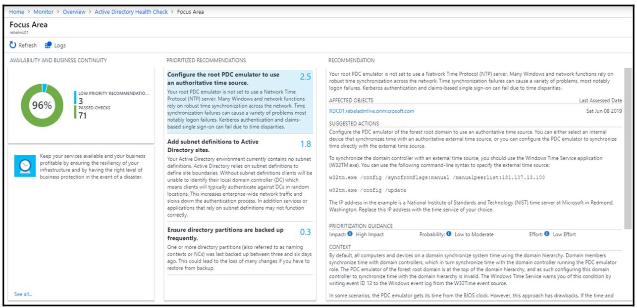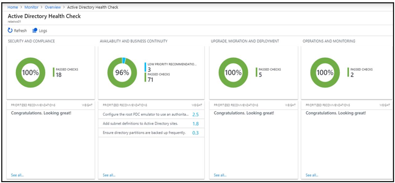 В некой среде SCOM мы способны отслеживать компоненты и службы AD применяя важные пакеты управления. Они собирают гигантский объём сведений. Однако для выявления потенциальных проблем инженерам требуется анализировать такие получаемые данные. Монитор Azure предоставляет два пакета решений, которые собирают сведения из некой среды AD и анализируют их за вас. После анализа они будут визуализированы в дружественном пользователю виде. Они также предоставит вам суть того как исправить выявленные проблемы, а также предоставит руководства относительно того как улучшить производительность, безопасность и высокую доступность имеющейся среды следующим образом: